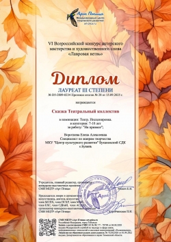МКУ «ЦКР» Букановский СДК Театральный коллектив «Сказка», руководитель Воротнева Е.А приняли участие VI Всероссийском конкурсе актерского мастерства и художественного слова «Лавровая ветвь» (онлайн) в номинации: Театр. Инсценировка. В категории: 7-10 лет за работу «На привале».