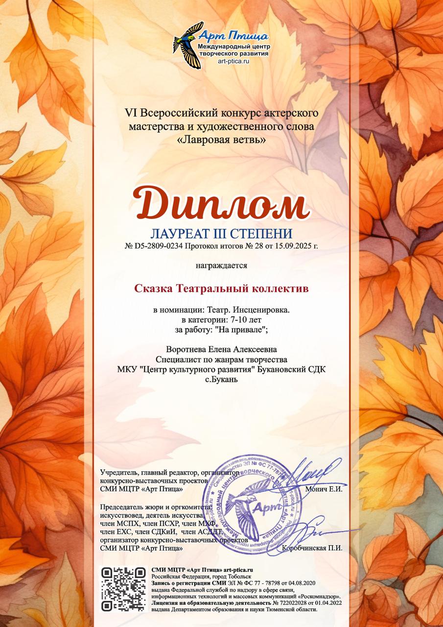 МКУ «ЦКР» Букановский СДК Театральный коллектив «Сказка», руководитель Воротнева Е.А приняли участие VI Всероссийском конкурсе актерского мастерства и художественного слова «Лавровая ветвь» (онлайн) в номинации: Театр. Инсценировка. В категории: 7-10 лет за работу «На привале».
