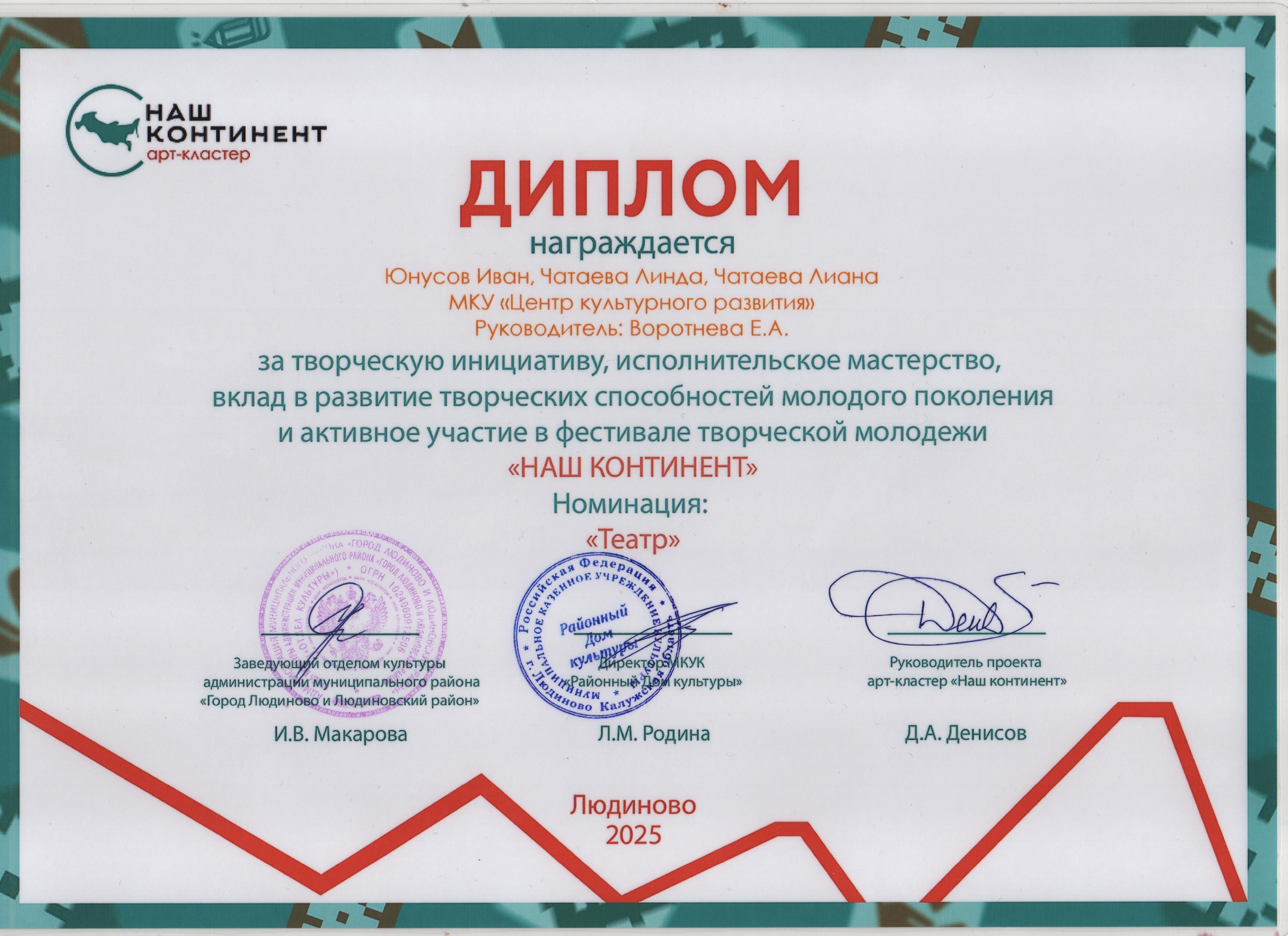 диплом "Наш континент" 2025-11-14 11:00 Участие в фестивале творческой молодежи " Наш Континент" РДК в номинации "Театр" руководитель Е.А.Воротнева МКУ "ЦКР" Букановский СДК